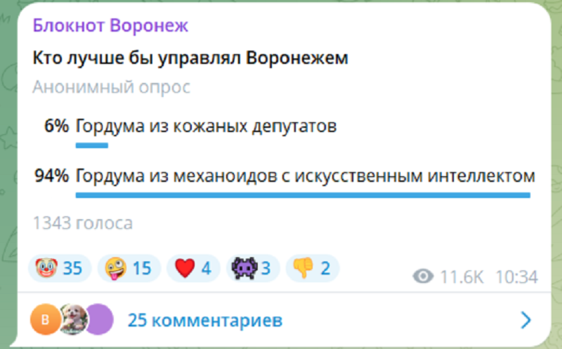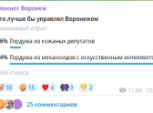 Мы решили продолжить тему и запустили в своем телеграм-канале опрос. В нем мы поинтересовались, кому воронежцы с большей охотой готовы доверить судьбу города – механоидам с искусственным интеллектом или привычным депутатам из кожи и плоти. Депутаты с треском проиграли. Их поддержали всего 6% из 1343 проголосовавших. Все остальные отдали свои симпатии механоидам.
