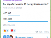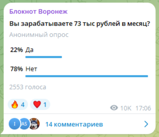 Глядя на такие показатели, «Блокнот Воронеж» спросил в своем телеграм-канале – зарабатывают ли наши читатели по 73 тысячи рублей в месяц? В опросе приняли участие две с половиной тысячи человек.