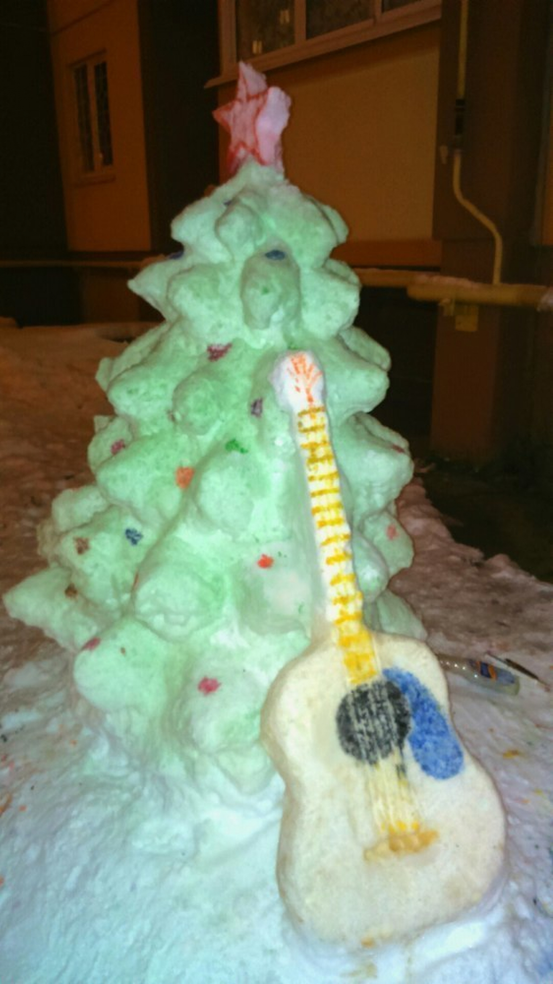 Жители Воронежа не стали дожидаться, когда на главной площади города установят новогоднюю ель, а слепили ее у себя во дворе из снега, покрасили в зеленый цвет, да еще и гитару рядом прилепили.