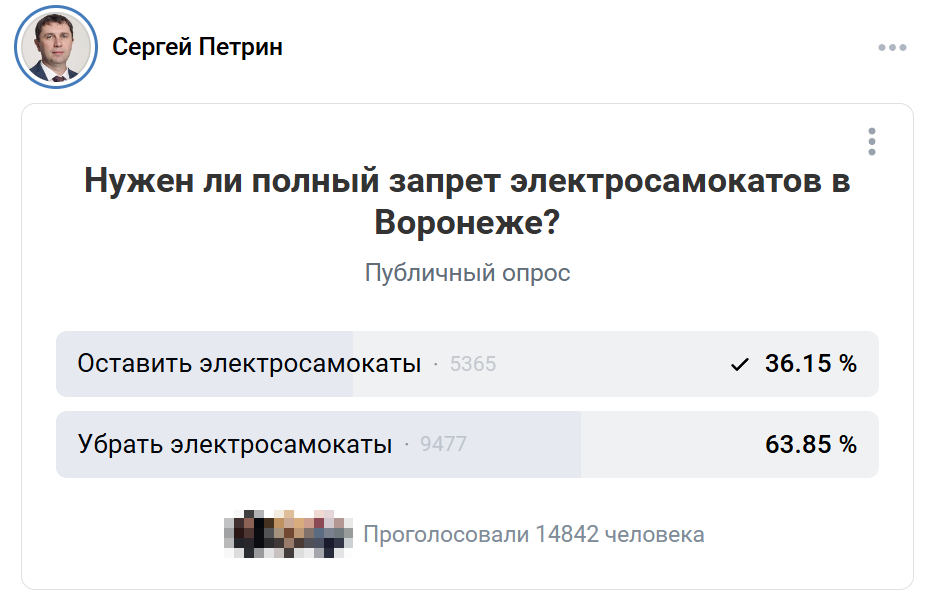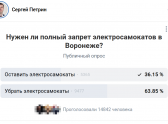 «Нужен ли полный запрет электросамокатов в Воронеже?» – спросил глава города местных жителей в Сети. Большинство – 9 477 человек – поддержало ограничения, остальные 5 365 воронежцев проголосовали против запрета, желая оставить электросамокаты.