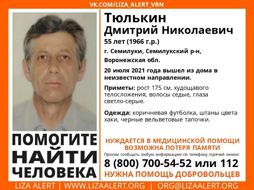 В первую минуту только начавшегося дня, а именно в 00:01 21 июля, волонтерский отряд «ЛизаАлерт» объявил о старте поисков 55-летнего Дмитрия Тюлькина из города Семилуки. Сутками ранее он вышел из дома в неизвестном направлении и бесследно исчез.