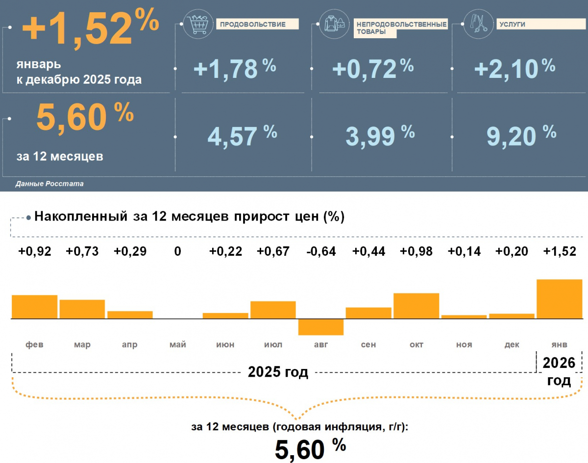 – Цены в Воронежской области в январе 2026 года выросли на 1,52% к декабрю 2025 года. Годовая инфляция увеличилась и составила 5,60%. Это ниже, чем в целом по стране (6,00%).