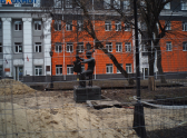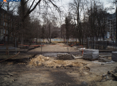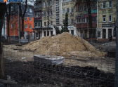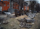 За ним - классическая картина для середины стройки - повсюду видны следы вскрытия грунта, горы песка, штабеля демонтированной плитки и старых бордюров, а также россыпи строительных материалов, ожидающих своей очереди для монтажа.
