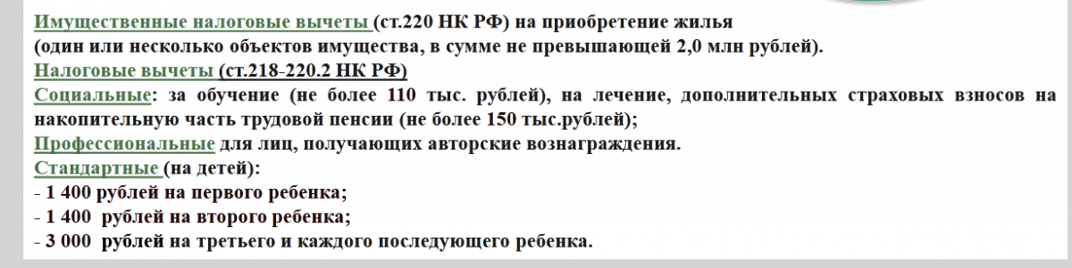 По ее словам, воронежцы стали чаще обращаться за получением различных налоговых вычетов, как на своих детей, так и за занятия фитнесом, сдачу норм ГТО и в целом по другим видам. По данным областного минфина, в текущем году для физических лиц предусмотрены такие виды налоговых вычеты или как в минфине их еще их называют - налоговые расходы: