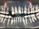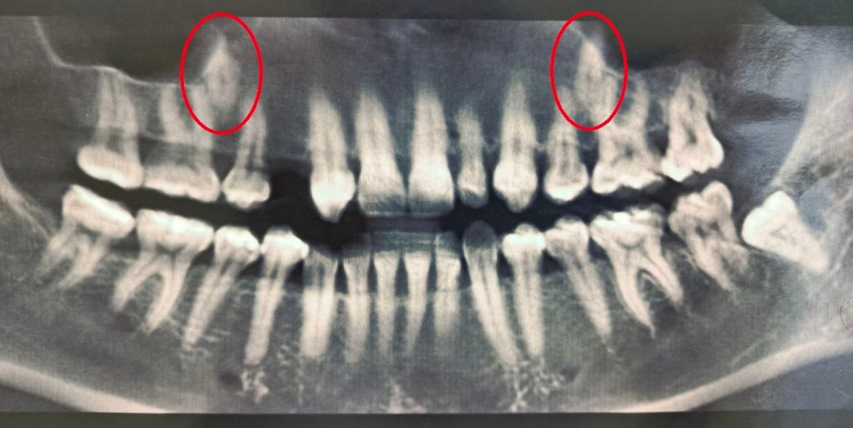На сегодняшний день один зуб уже полностью вышел из костной ткани и занял свое законное место. Второй успешно проходит последний барьер - кортикальную пластинку челюсти - и вскоре тоже встанет в ряд.