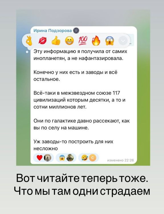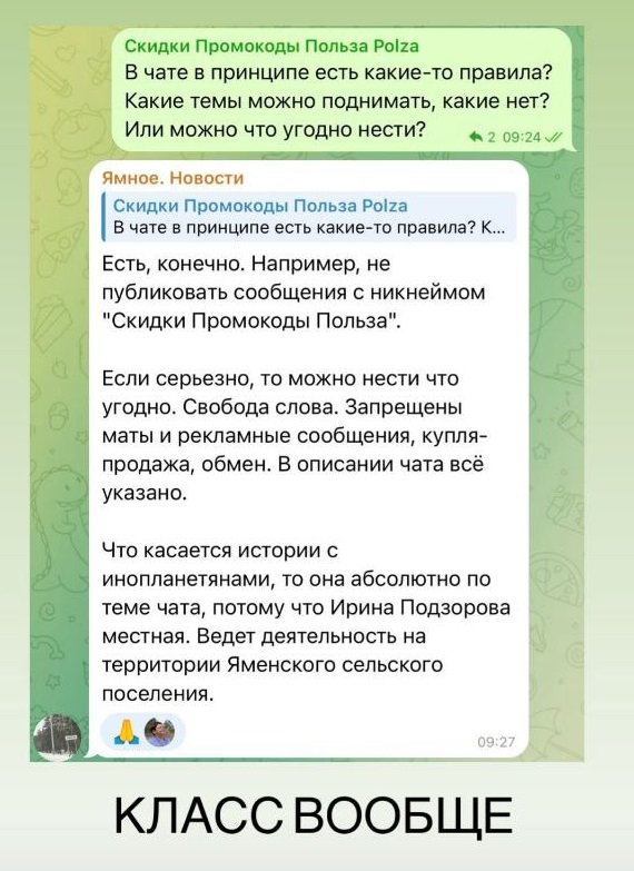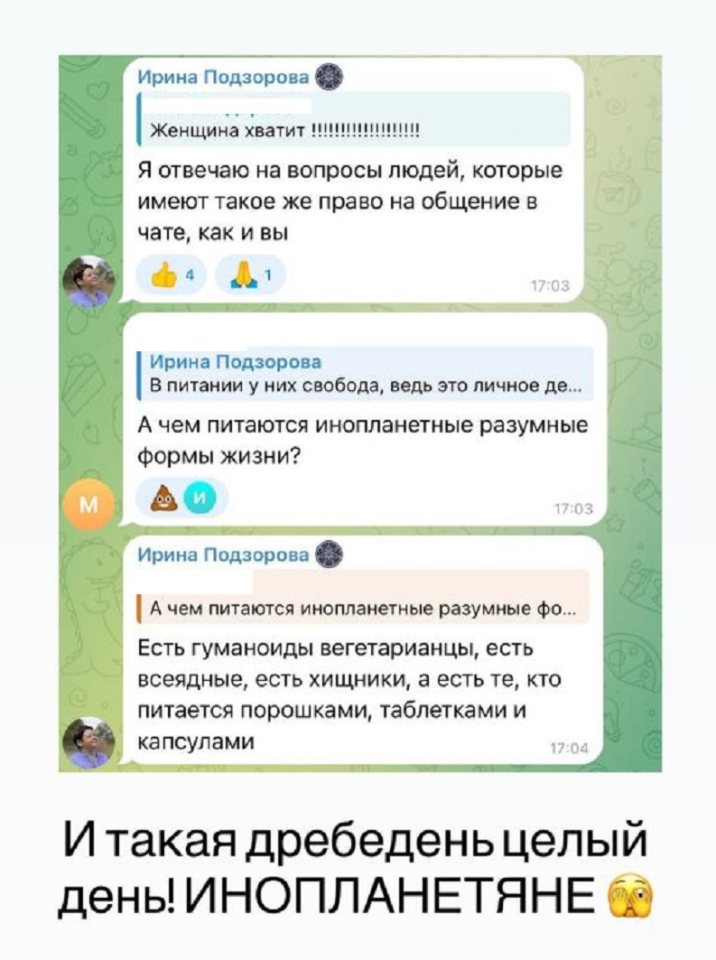 «Я вчера удалилась из чата нашей деревни, потому что людям там настолько напекло голову, что стало невыносимо уже читать этот бред», – написала Польза и поделилась скриншотами убойного пригородного чтива. Оказалось, что у посельчан популярна не Польза, а другая персона – Кассиопея, контактер с внеземными цивилизациями с 1999 года. 26 лет стажа общения с зелеными человечками помогает космоблогерше окучивать и аудиторию интернет-сообщества.