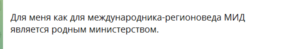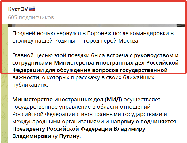 Интересно, что в данном сообщении своего ТГ-канала Данил Кустов себя позиционировал уже не как выпускник (2005 года) экономического факультета Воронежского аграрного университета по специальности «Бухгалтерский учет, анализ и аудит», а как «международника - регионоведа, для которого МИД является родным министерством».