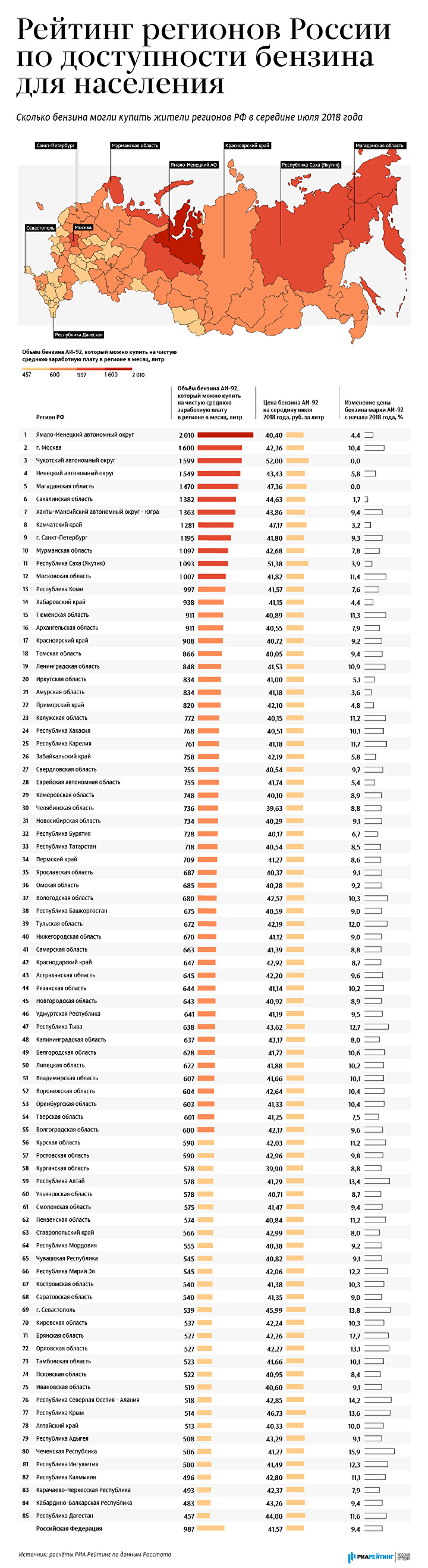 Наиболее доступным бензин в России оказался в Ямало-Ненецком автономном округе. Там местные водители могли на свои среднемесячные зарплаты приобрести 2010 литров топлива. Следом идет Москва с показателем 1600 литров. Наконец, на третьем месте расположился Чукотский автономный округ (1599 литров).