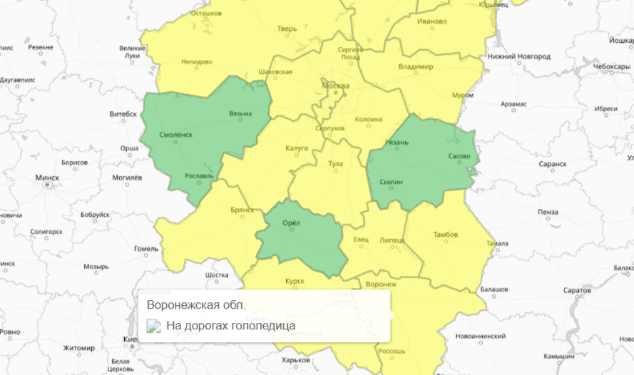 Прогностическая карта метеопредупреждений на 24-48 ближайших часов от Росгидрометцентра открасила Воронежскую область в желтый цвет. До 18:00 10 января у нас действует предупреждение о гололедице на дорогах. Отметим, что желтый уровень – это когда погода «потенциально опасна».