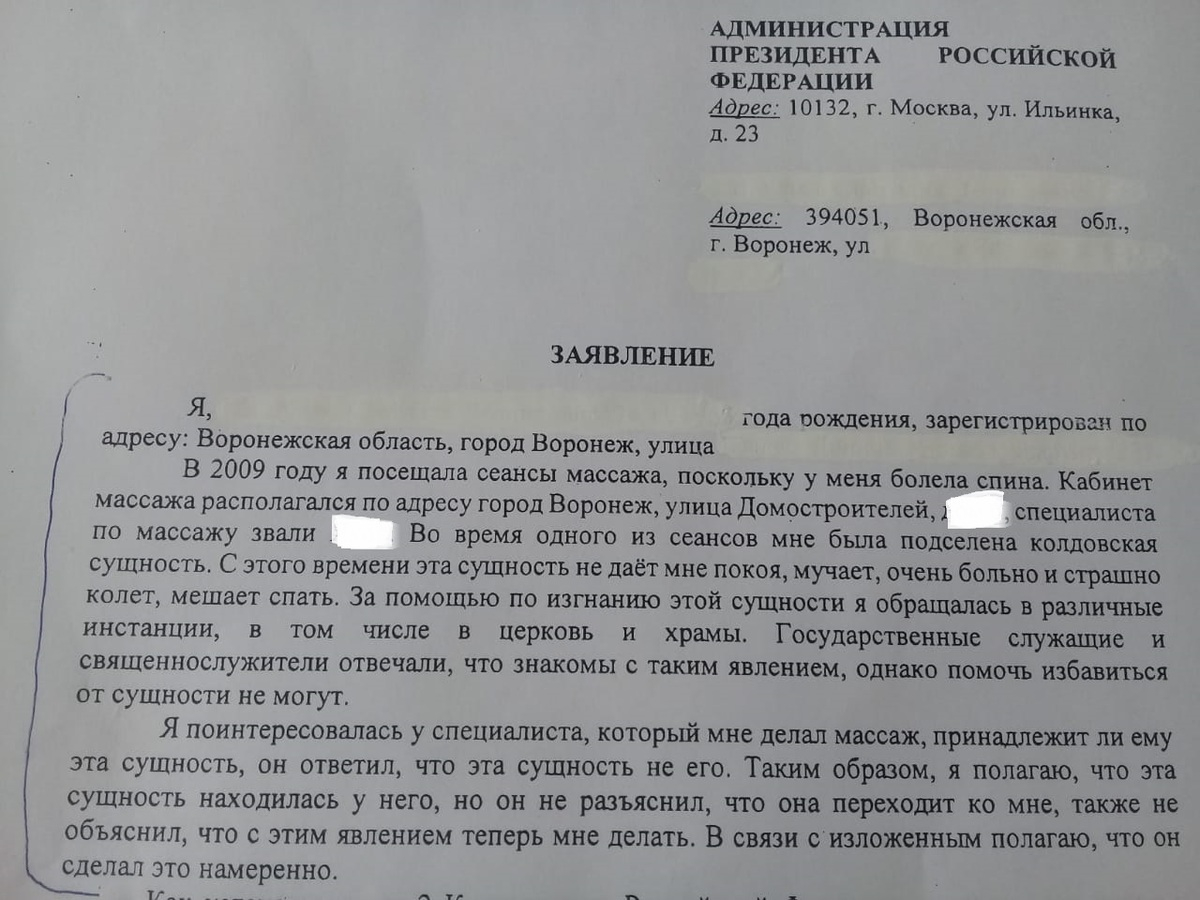 Женщина пожаловалась президенту на подселенную в нее колдовскую сущность в Воронеже