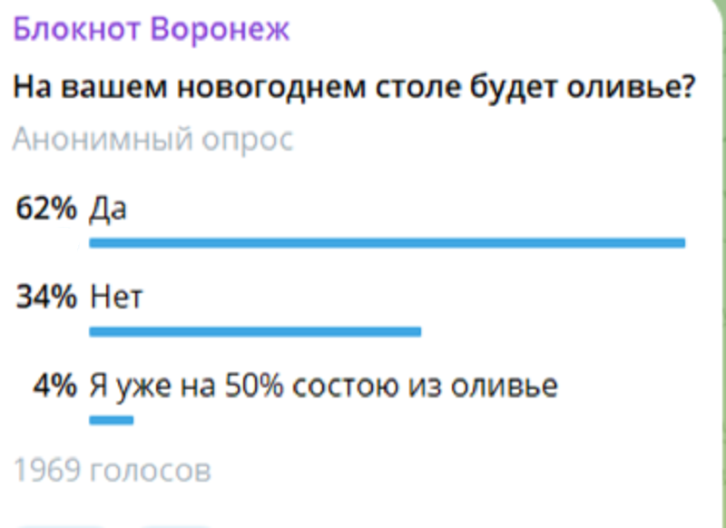 Нонче тренд обновлять новогодние столы и заменять советскую классику чем-нибудь новым. Чтобы проверить, насколько реальна эта тенденция, запустили опрос и… ну, что-то такое есть. Из 1969 наших читателей 672 предпочли не ставить на новогодний стол даже оливье. Это 34% опрошенных. Объясняют люди свой выбор по-разному, но вот самый яркий вариант обоснования: