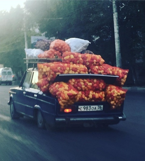 Под тяжестью перцев отечественная машина опустилась, также создается ощущение, что некоторый груз вот-вот готов вывалиться из багажника и рассыпаться по улице. Отметим, баулы с овощами закрывают заднее стекло, что создает опасность для участника дорожного движения.