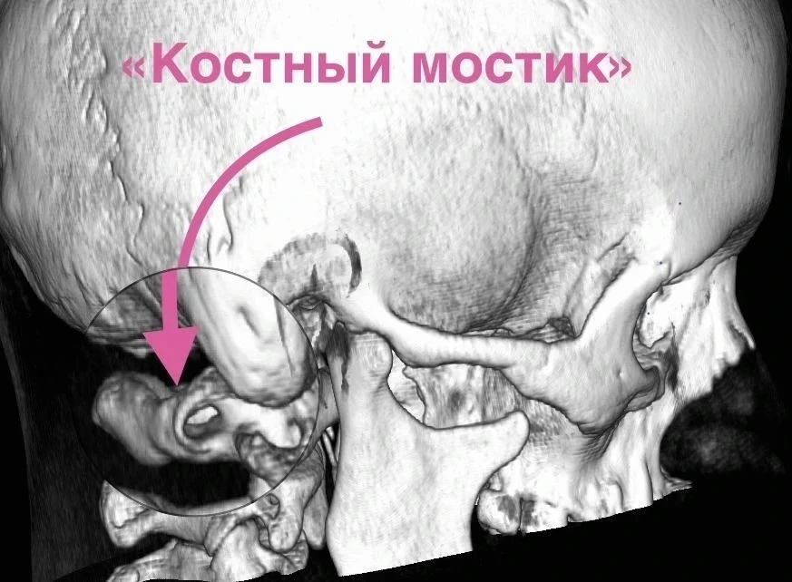 Это врожденная патология, при которой на первом шейном позвонке (атланте) формируется дополнительная костная дужка, образующая своеобразный мостик. Этот мостик сдавливает жизненно важную позвоночную артерию, нарушая кровообращение мозга.