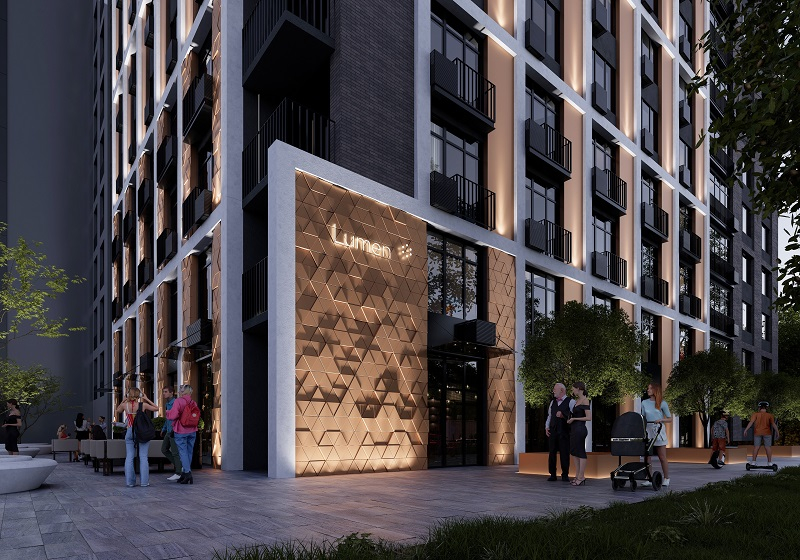 Современный фасад «Люмен» с золотистыми панелями и большими витражными окнами подчеркивает статус комплекса. Развитая инфраструктура - детские сады, школы, вузы и бизнес-центры - обеспечивает комфорт для семей с детьми. Коммерческие помещения на первом этаже создают дополнительные удобства, а благоустроенная дворовая территория завершает теплую и уютную атмосферу клубного дома.