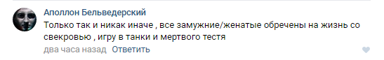 - Только так и никак иначе. Все замужние/женатые обречены на жизнь со свекровью, игру в танки и мертвого тестя, - отметил Аполлон Бельведерский.