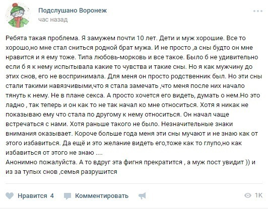 – Мне стал сниться родной брат мужа. И не просто, а сны, будто он мне нравится и я ему тоже. Типа любовь-морковь и все такое. Было б не удивительно, если б я к нему испытывала какие-то чувства и такие сны, – пишет она. – Но я как мужчину до этих снов его не воспринимала. Для меня он просто родственник был. Но эти сны стали такими навязчивыми, что я стала замечать ,что меня после них начало тянуть к нему.