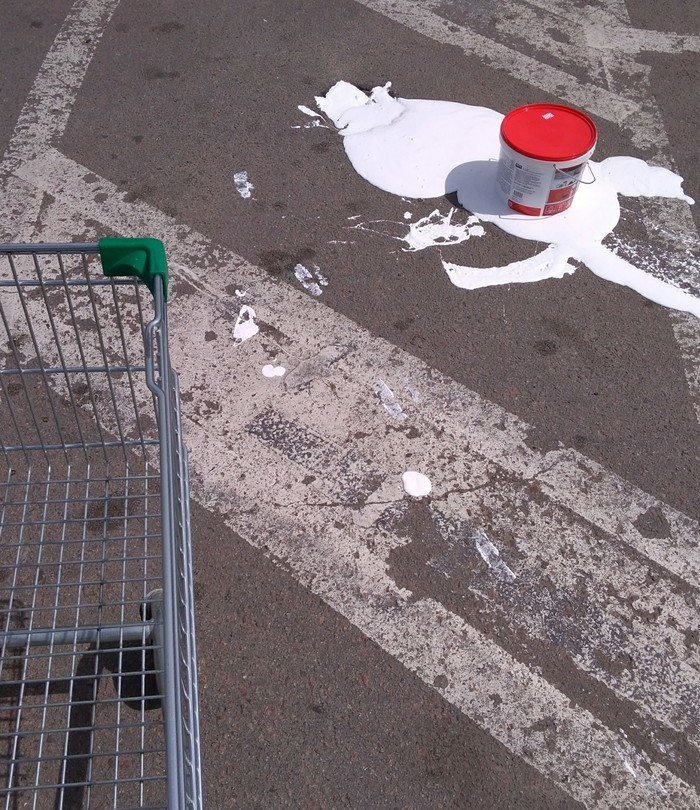 Девушка рассказала, что купила несколько больших ведер шпаклевки в местном строительном магазине. Погрузив приобретенные товары в тележку, она направилась к автомобилю. Но колесо тележки внезапно наехало на яму и пятикилограммовая банка со шпаклевкой "выпрыгнула" и разлилась по асфальту.