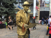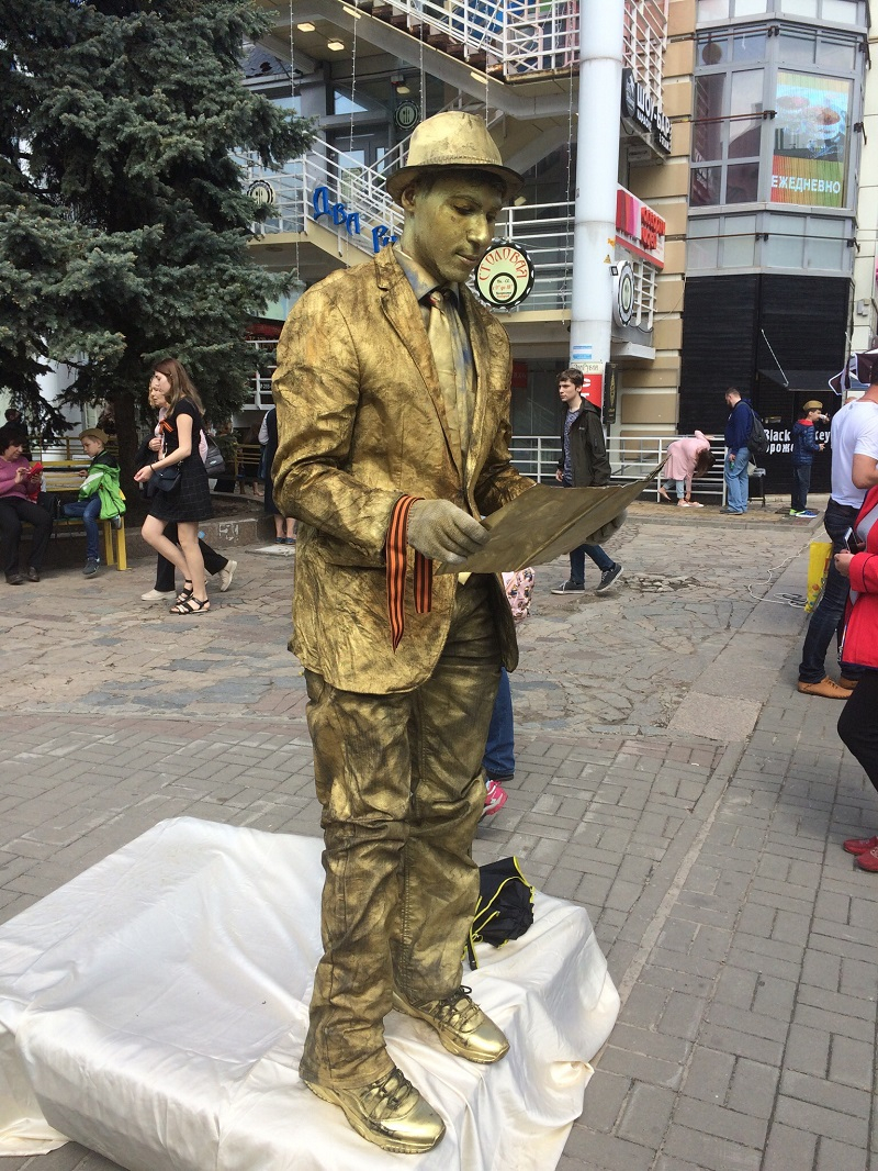 Так, у Воронежского театра кукол им. Вольховского горожане увидели юношу в шляпе и с газетой. Его открытые участки тела и одежда были полностью покрыты золотой краской. Люди, наблюдавшие за ним, были удивлены, как на протяжении нескольких минут он умудрялся уверенно находиться в одной и той же позе. Парня рассматривали со всех сторон, а некоторые даже подумали, что перед ними просто реалистичный робот.