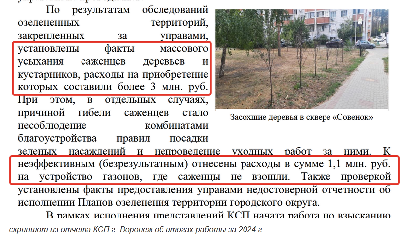 Помимо гибели растений заказчики - ряд районных Управ - переплачивали денежные средства подрядчикам по озеленению, что было выявлено проверками КСП в прошлом году. В нынешнем в рамках проведения политики "озеленения города" аудиторы выявили, что в Коминтерновском, Центральном и Советском районах были завышены объемы работ по содержанию озелененных территорий. Из-за этого комбинаты получили необоснованную субсидию на 2,1 млн. рублей.