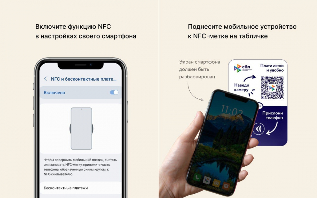 2 способ. Оплатить по NFC-метке. Перед оплатой убедитесь, что ваш смартфон поддерживает функцию NFC. Разблокируйте и приложите смартфон к NFC-метке на табличке.