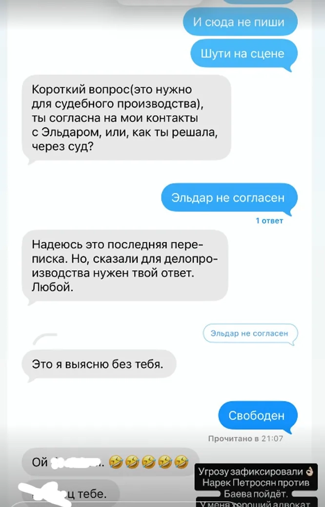 В другом сообщении актер написал: «Я предупреждал… это коснулось моей семьи. Значит, стопов не будет». Сама Эльвира заявляет, что воспринимает слова как прямую угрозу, уже заручилась юридической поддержкой и не намерена отдавать ребенка.